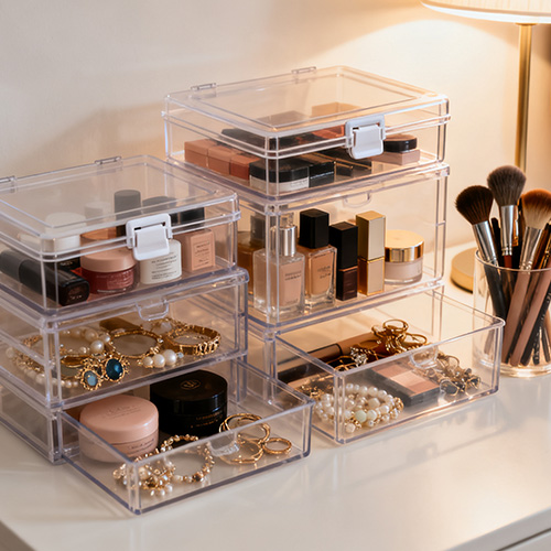 Làm đẹp và chăm sóc da: Hộp đựng trong suốt bằng PC dùng để đựng son môi, phấn mắt và cọ trang điểm. Nó có thể được thiết kế với cấu trúc ngăn kéo nhiều lớp. Lớp trên dùng để đặt vật dụng thường xuyên, lớp dưới dùng để đựng hàng hóa; Hộp đựng nhỏ có vách ngăn dùng để phân loại những vật dụng dài và mỏng như bút kẻ mắt, bút kẻ mắt để tránh lộn xộn.
